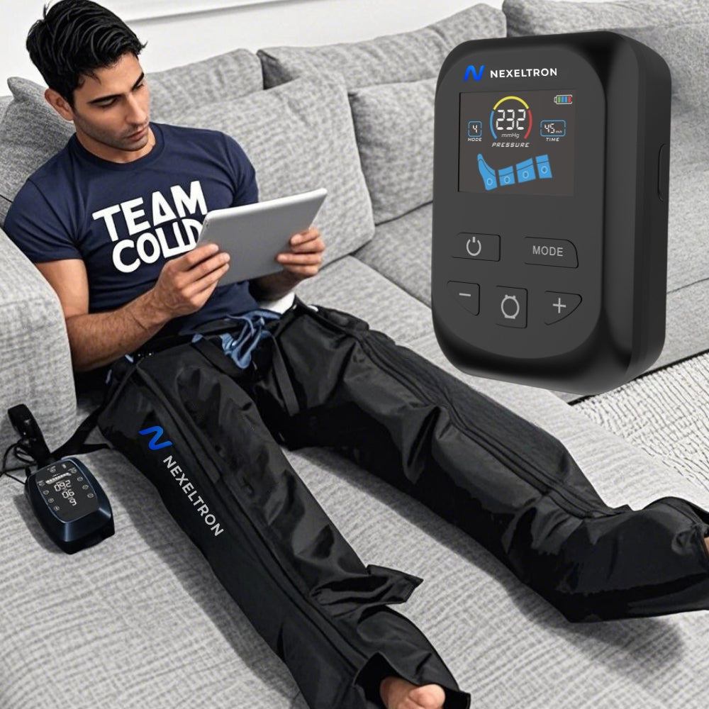 Zaawansowany aparat do drenażu limfatycznego i masażu uciskowego nóg. Pomaga zmniejszyć uczucie ciężkich nóg, napięcie i zmęczenie po treningu lub długim dniu. Profesjonalna regeneracja – w Twoim domu.