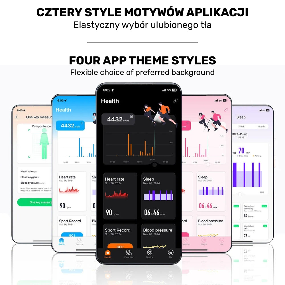 Jasny, ciemny, różowy czy klasyczny – dopasuj interfejs do swojego nastroju i śledź dane zdrowotne w ulubionym stylu!