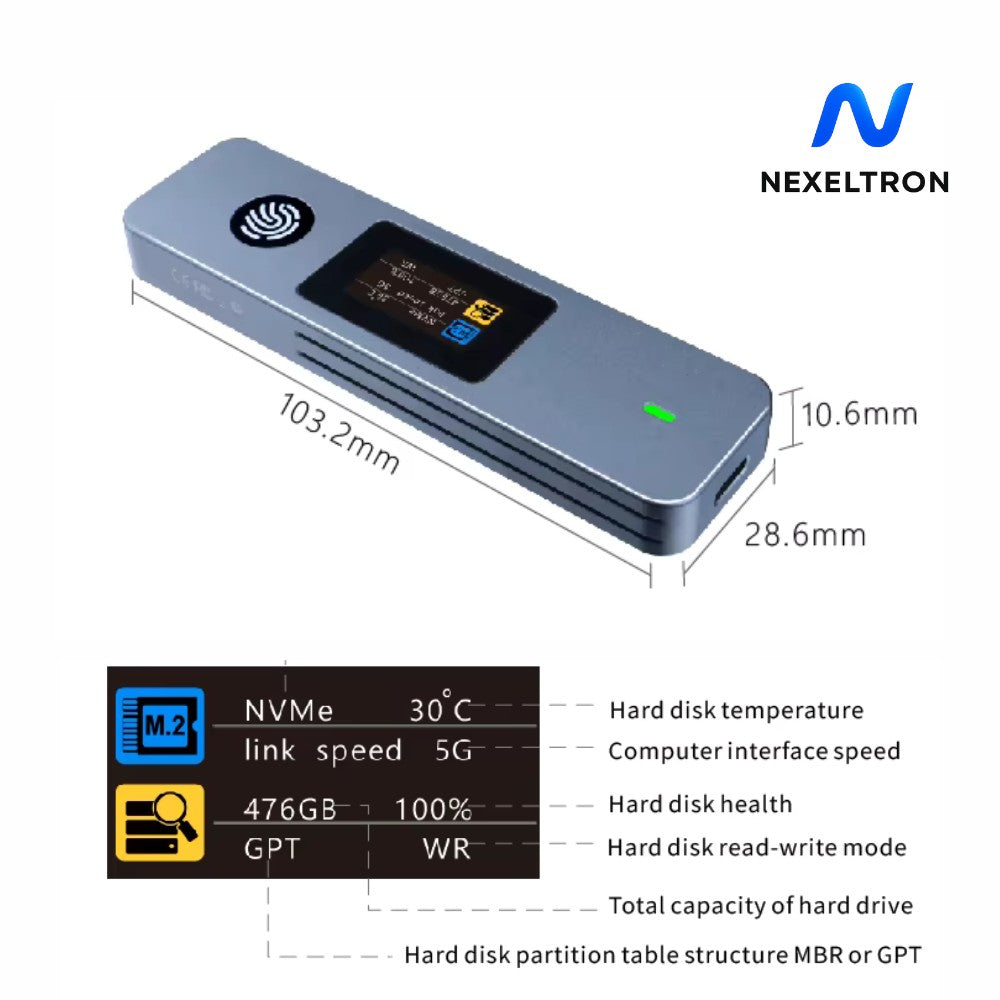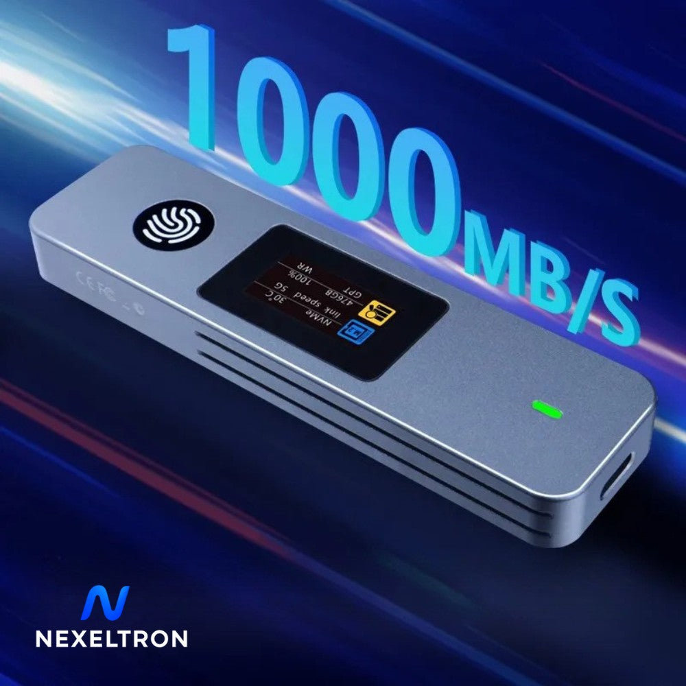 Nexeltron BioTouch BT10 – obudowa SSD z czytnikiem linii papilarnych i kolorowym ekranem LCD. Łączy nowoczesne szyfrowanie biometryczne z ultraszybkim transferem do 1000 MB/s, zapewniając pełną kontrolę i spokój o Twoje dane.