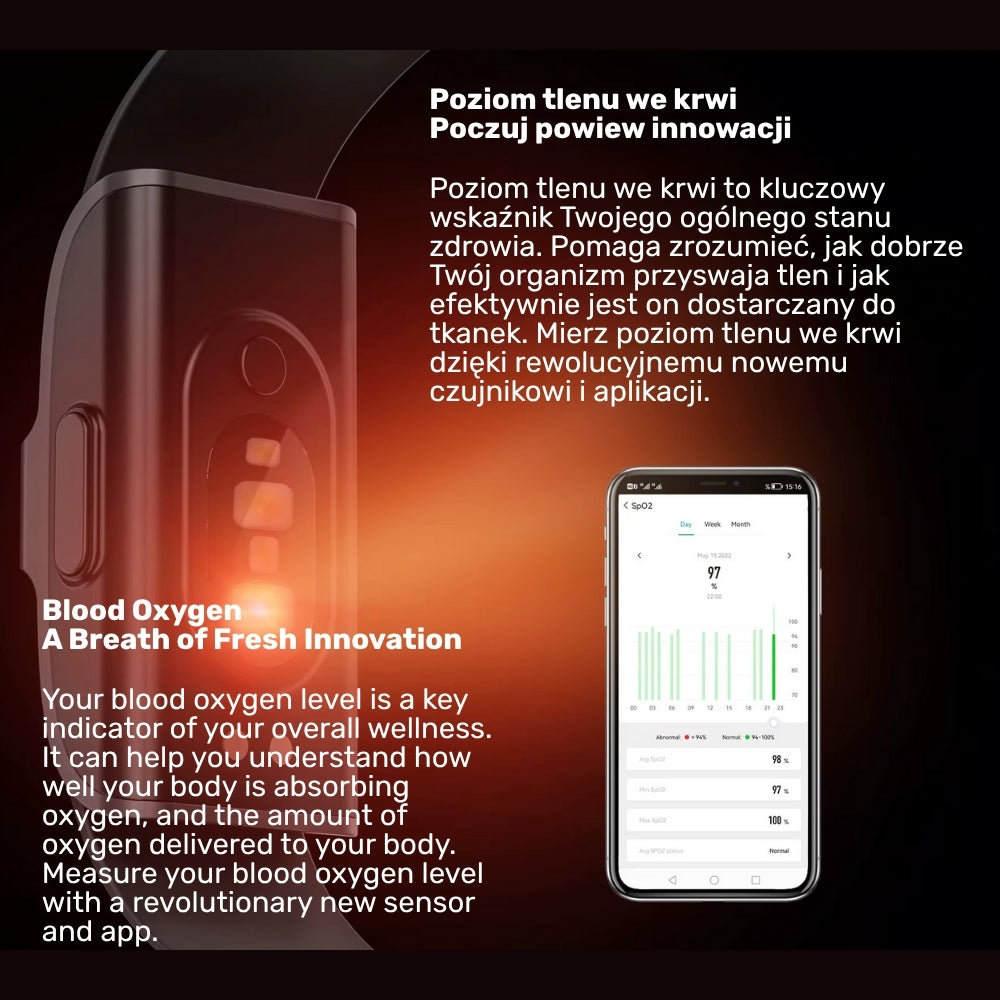 • Czujniki: tętno, saturacja (SpO₂), ciśnienie krwi, temperatura ciała, akcelerometr 3D, czujnik światła RGB