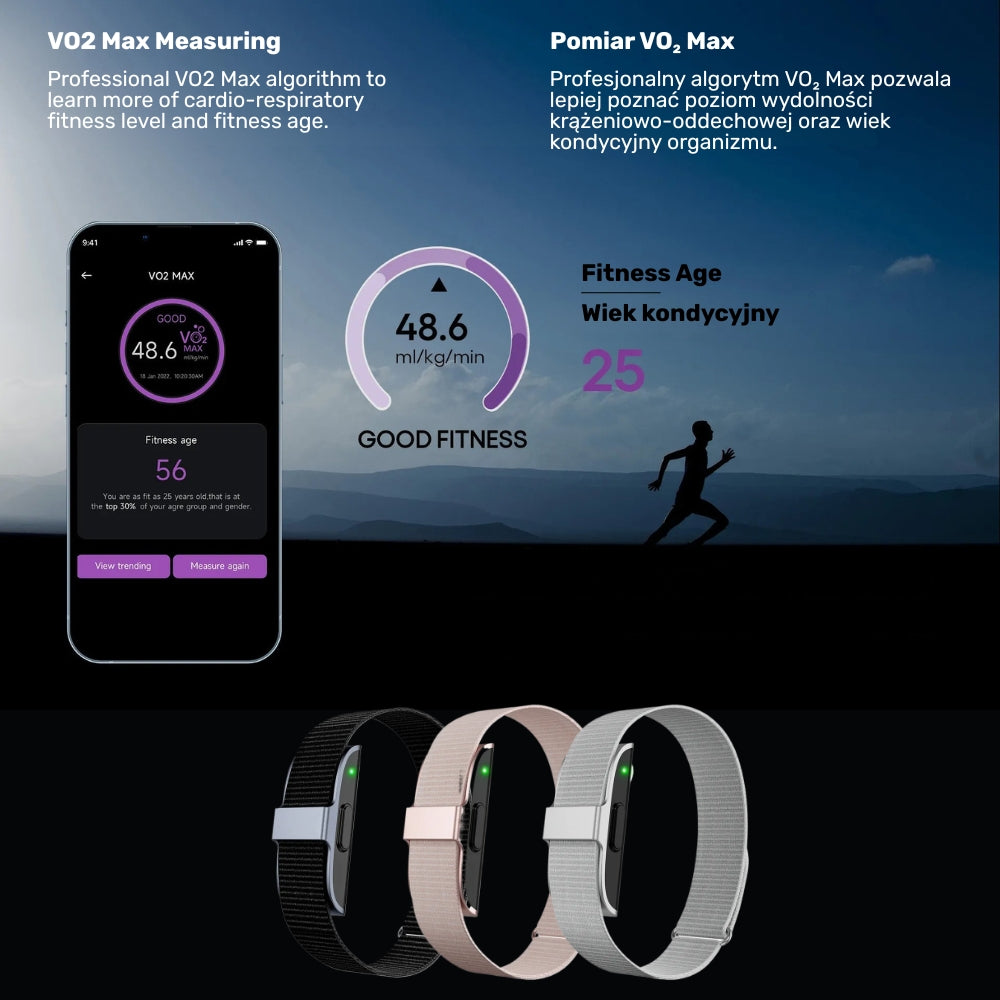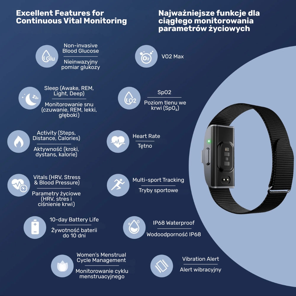 • Funkcje zdrowotne: Analiza trendów glukozy BGEM™, Wskaźniki metaboliczne i profilaktyka zdrowotna, HRV, stres, VO₂ Max, Śledzenie snu (REM, Light, Deep), Inteligentna analiza organizmu 24/7