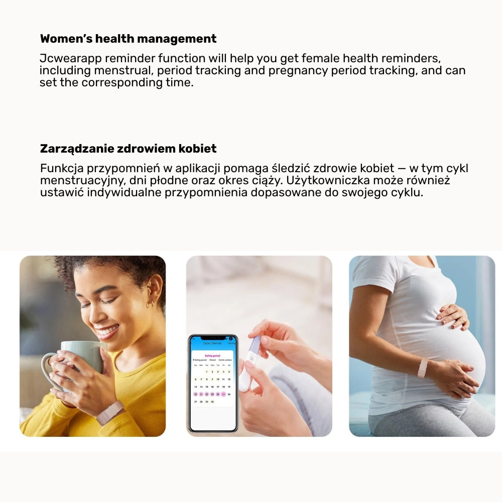 • Funkcje codzienne: monitoring zdrowia 24/7, powiadomienia wibracyjne, wskaźnik regeneracji, zarządzanie cyklem menstruacyjnym i ciążą