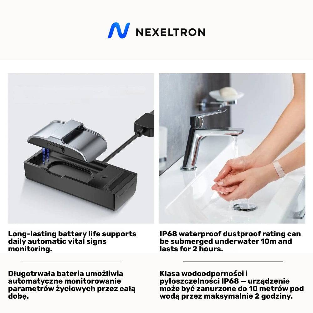Zaawansowana opaska z technologią BGEM™ do orientacyjnego monitorowania trendów glukozy, tętna i natlenienia krwi. Śledź sen, stres i aktywność 24/7 – z elegancją Nexeltron i technologią przyszłości.
