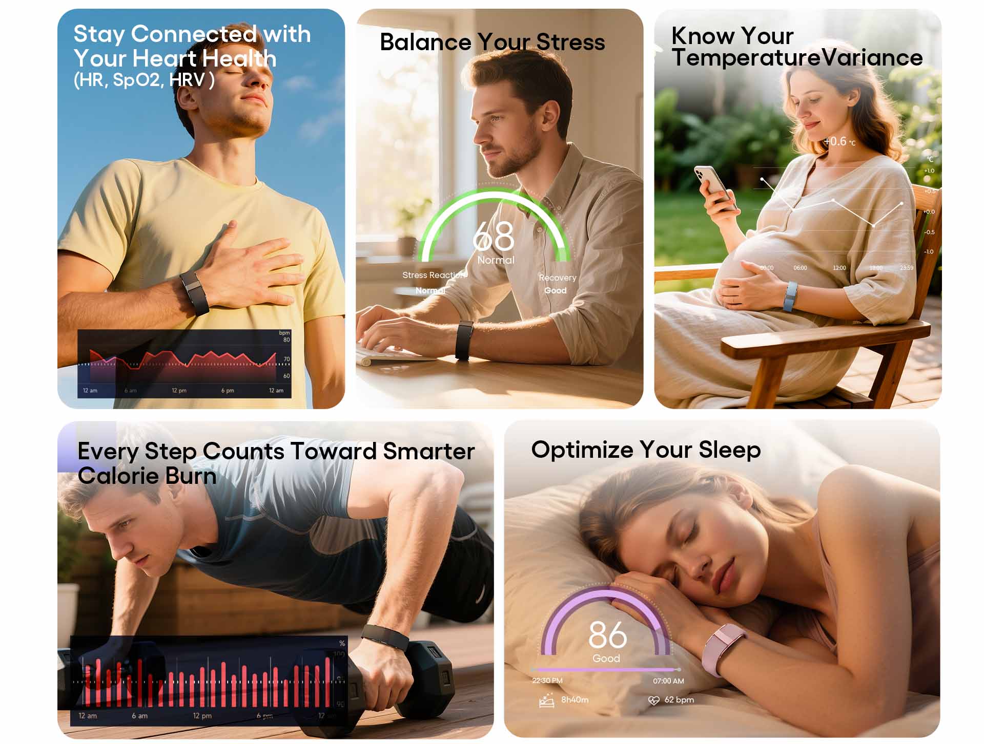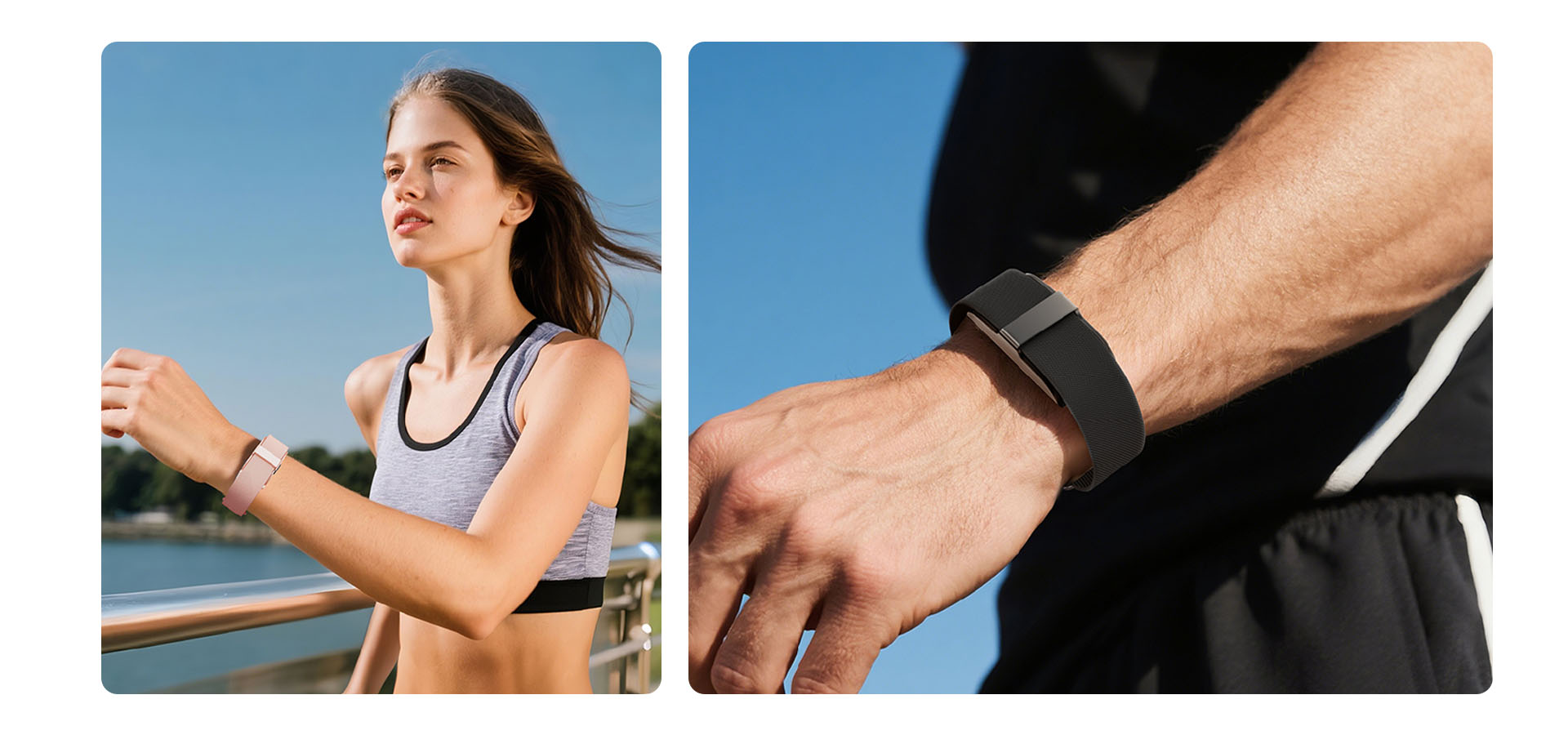 Bez ekranu. Bez hałasu. Tylko dane, które mają znaczenie. Czysta, pozbawiona ekranu opaska, która pozwala Ci skupić się na chwili — podczas gdy Twoje zdrowie jest cicho i nieprzerwanie monitorowane w tle.