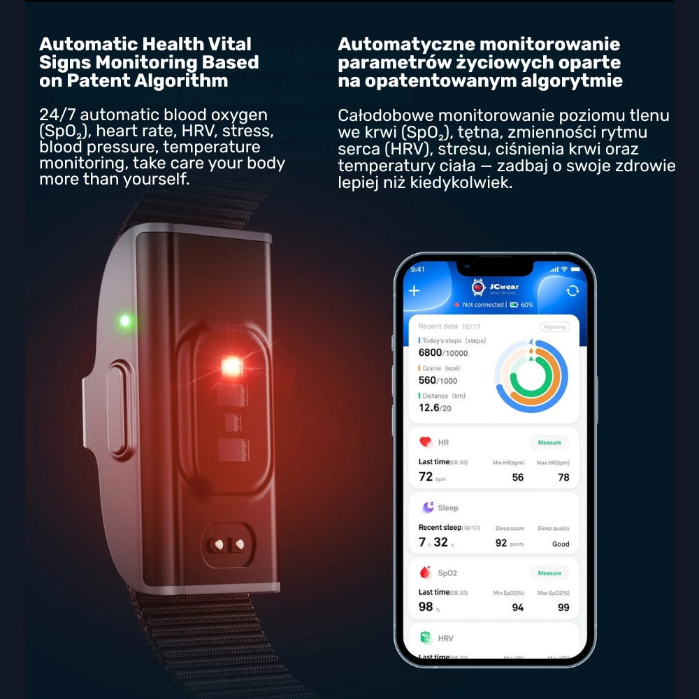 • 💓 Ciągły monitoring zdrowia 24/7 – tętno, SpO₂, ciśnienie, stres, temperatura