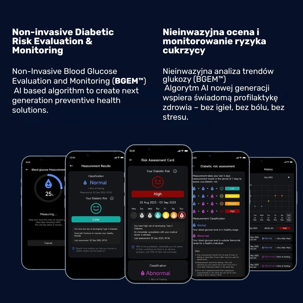 • Orientacyjny pomiar trendów glukozy (BGEM™) – bez igieł, bez bólu, dla codziennej kontroli samopoczucia.
