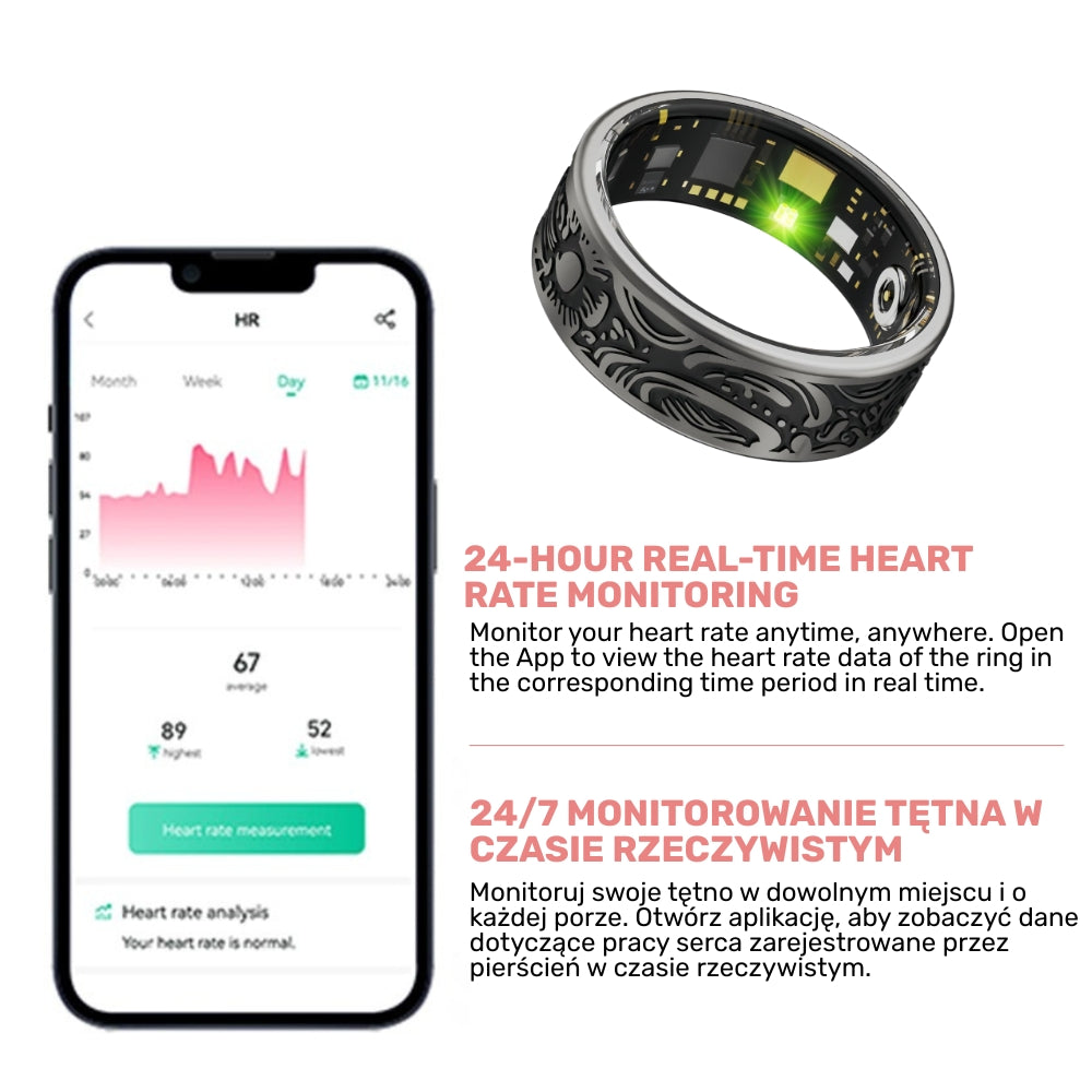 Raven Smart Ring monitoruje pracę Twojego serca 24/7 — dokładnie, w czasie rzeczywistym i bez przerw. Wszystkie dane zobaczysz w aplikacji Smart Health.
