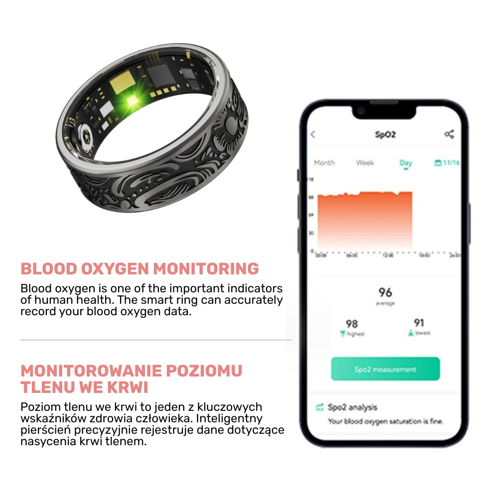 Kontroluj saturację krwi w każdej chwili. Raven Smart Ring dokładnie mierzy poziom tlenu, pomagając Ci monitorować kondycję i samopoczucie każdego dnia.