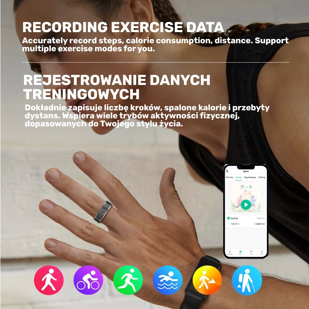 Rejestruj kroki, dystans, kalorie i tryby treningu. Raven Smart Ring wspiera wiele form aktywności, pomagając Ci śledzić postępy i utrzymać motywację.