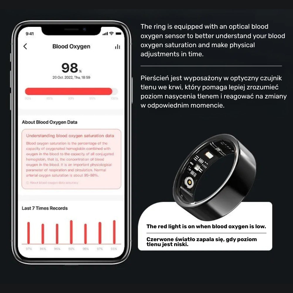 Pierścień AeroFIT wyposażony jest w optyczny czujnik saturacji, który na bieżąco monitoruje poziom tlenu we krwi. Pomaga wykryć spadki i reagować, zanim poczujesz zmęczenie.